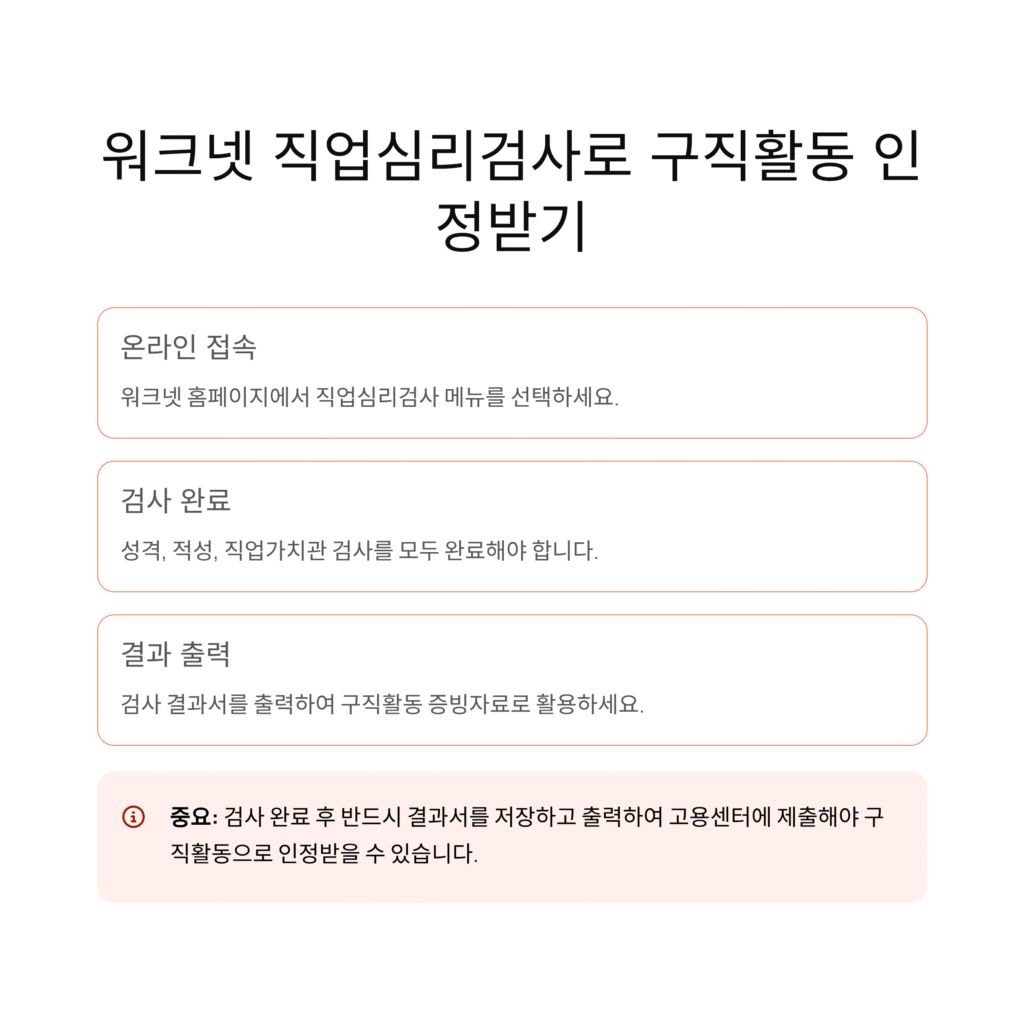 직업심리검사는 단순히 구직활동 인정 자료에 그치지 않고, 개인의 성향과 강점을 구체적으로 확인할 수 있어 향후 이력서 작성이나 면접 준비에도 도움이 됩니다.